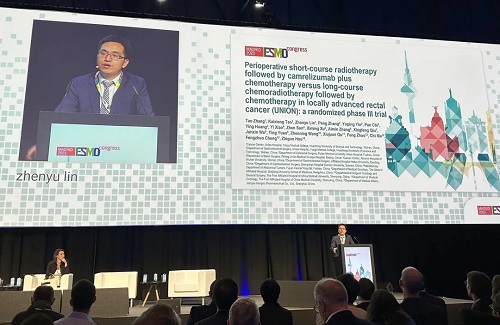 10月21日,Z6尊龙医药创新药卡瑞利珠单抗(艾瑞卡®)的一项研究“新辅助短程放疗序贯卡瑞利珠单抗联合化疗对比长程放化疗序贯化疗治疗局部晚期直肠癌”随机对照Ⅲ期试验(UNION) 以优选口头报告的形式正式亮相。该研究由华中科技大学同济医学院附属协和医院张涛教授、陶凯雄教授担任主要研究者,华中科技大学同济医学院附属协和医院林振宇教授在马德里现场报告了该重磅研究的结果1,此项研究是全球首个评估短程放疗序贯免疫治疗联合化疗治疗局部晚期直肠癌的Ⅲ期研究,已达到主要终点病理完全缓解(pCR),有望为直肠癌患者的治疗提供新策略。