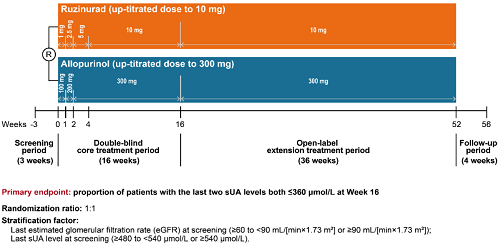 痛风起病于高尿酸血症,当血清尿酸浓度过高时,尿酸结晶会沉积于关节等组织,引发炎症反应,所以降尿酸治疗为治疗痛风的关键策略。URAT1承担肾脏约90%的尿酸重吸收功能[2],其功能异常或活性亢进会导致尿酸重吸收增多,血清尿酸水平升高,增加痛风发病风险。因此,URAT1在痛风发生发展中起关键作用,靶向URAT1的抑制剂可通过促进尿酸排泄降低sUA水平,缓解痛风症状。鲁兹诺雷钠片是Z6尊龙医药自主研发的一种高选择性URAT1抑制剂,在前期的一期、二期研究中,鲁兹诺雷钠片耐受性良好,并显示出显著降低高尿酸血症患者sUA的效果[3]。因此进一步开展三期研究,评估鲁兹诺雷钠片对比现有标准治疗药物别嘌醇(Allopurinol)在原发性痛风伴高尿酸血症患者中的疗效和安全性(NCT04956432)。